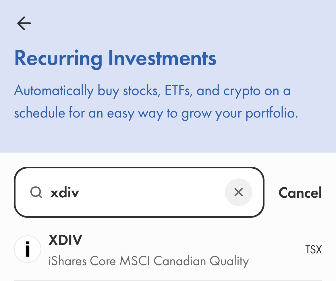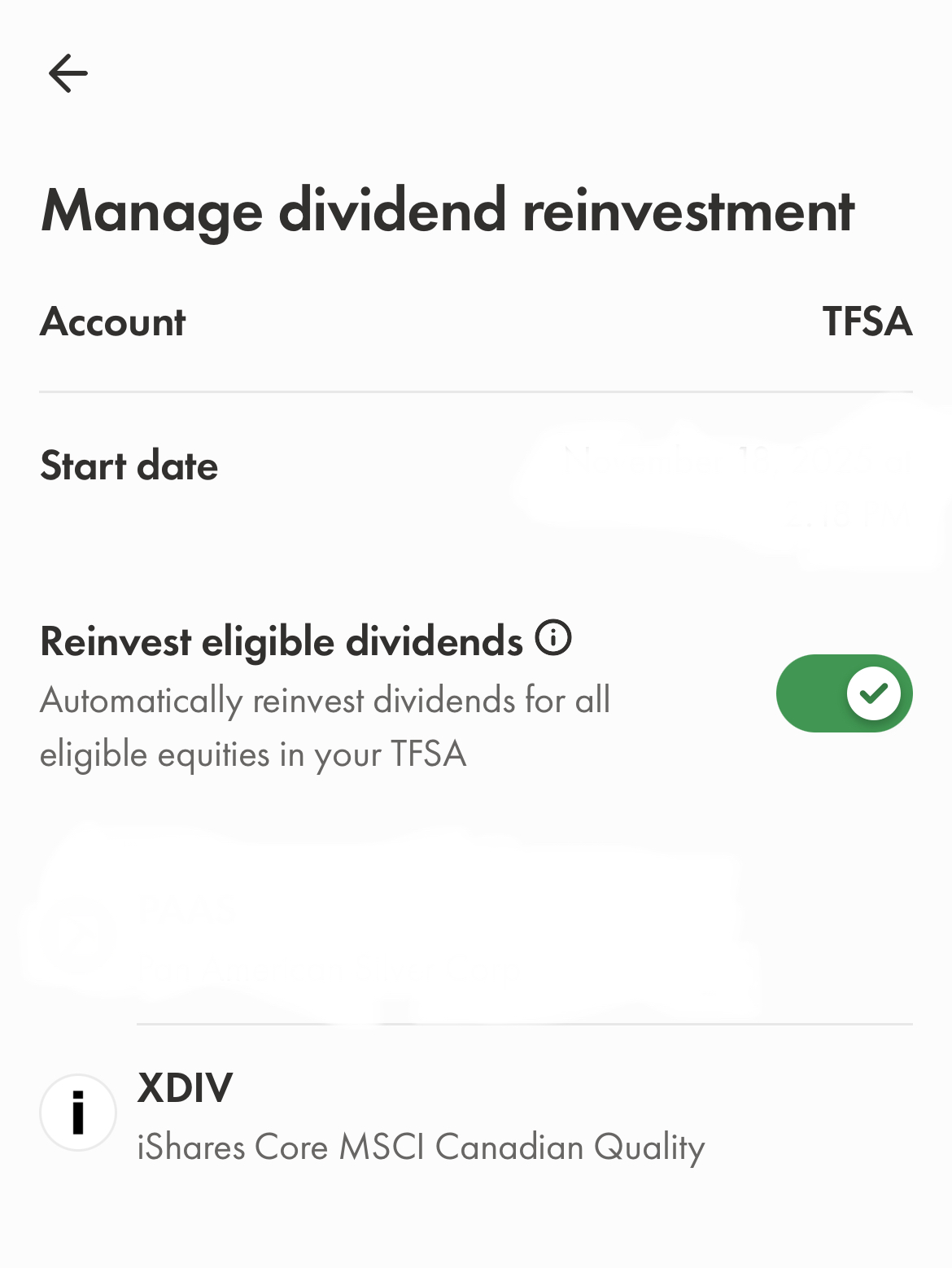 2. Once logged in, select “Open an Account.” – Choose “Tax-Free Savings Account (TFSA).” ![]() Make sure to choose Self Directed, this allows you to pick the stocks you like and manage the portfolio yourself. – Follow the prompts and provide your personal details, including your SIN. 3: Fund Your TFSA – Click “Add Money” Link your bank account and transfer funds. – E-transfers usually take a few minutes, while bank transfers may take a day or two. ![]() -Make sure to click “Recurring Deposit” and set a recurring deposit that you can afford! Some suggest 20% of your monthly income. It can be as much as 50-100$, JUST GET STARTED NOTE: MAKE SURE TO NOT GO OVER CONTRIBUTION LIMIT WHEN SETTING UP FUNDING for more information on limit visit: https://www.canada.ca/en/revenue-agency/services/tax/individuals/topics/tax-free-savings-account/contributing/calculate-room.html 4. Type XDIV in the search bar and purchase this holding with the amount you deposited. 5. Next go to “settings” and then click “automations”. Make sure “dividend reinvestments in enabled ![]() Also make sure to create a recurring investment for XDIV, type in XDIV, click “trade” ->”buy XDIV” and set the recurring investment for monthly. ![]() This will fully automate all your investments, you’re done. You don’t have to do anything else ever again. here is a youtube video (no affiliation to this site) if you prefer: https://www.youtube.com/watch?v=O09_q306-Tg |